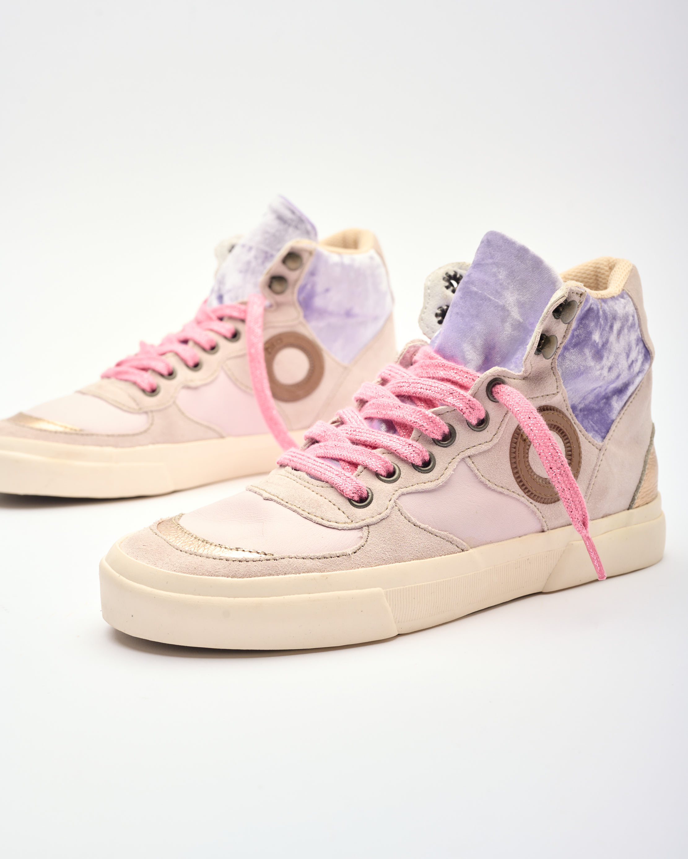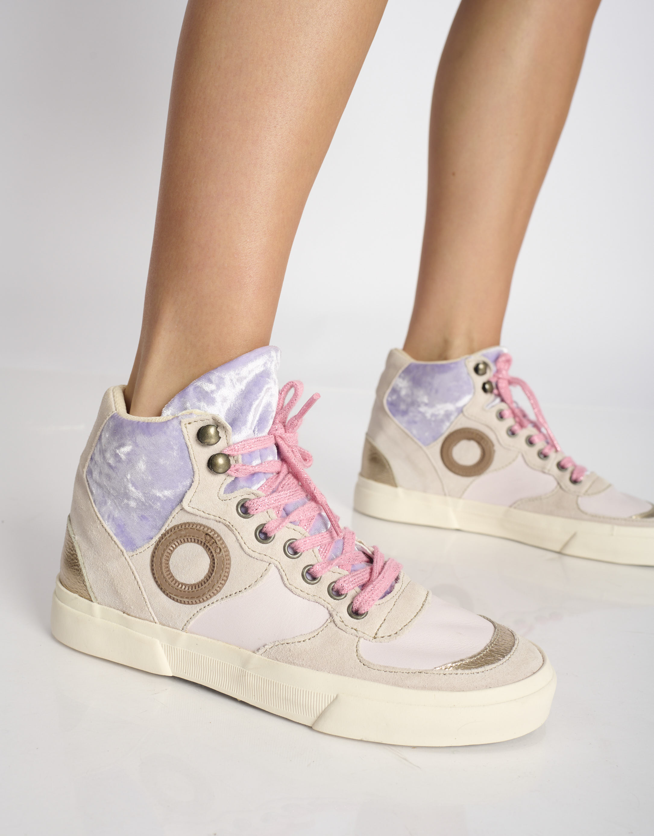 נעלי סניקרס גבוהות עשויות משילוב עור, זמש וקטיפה. לנעליים רפידה נשלפת וסוליה גמישה.