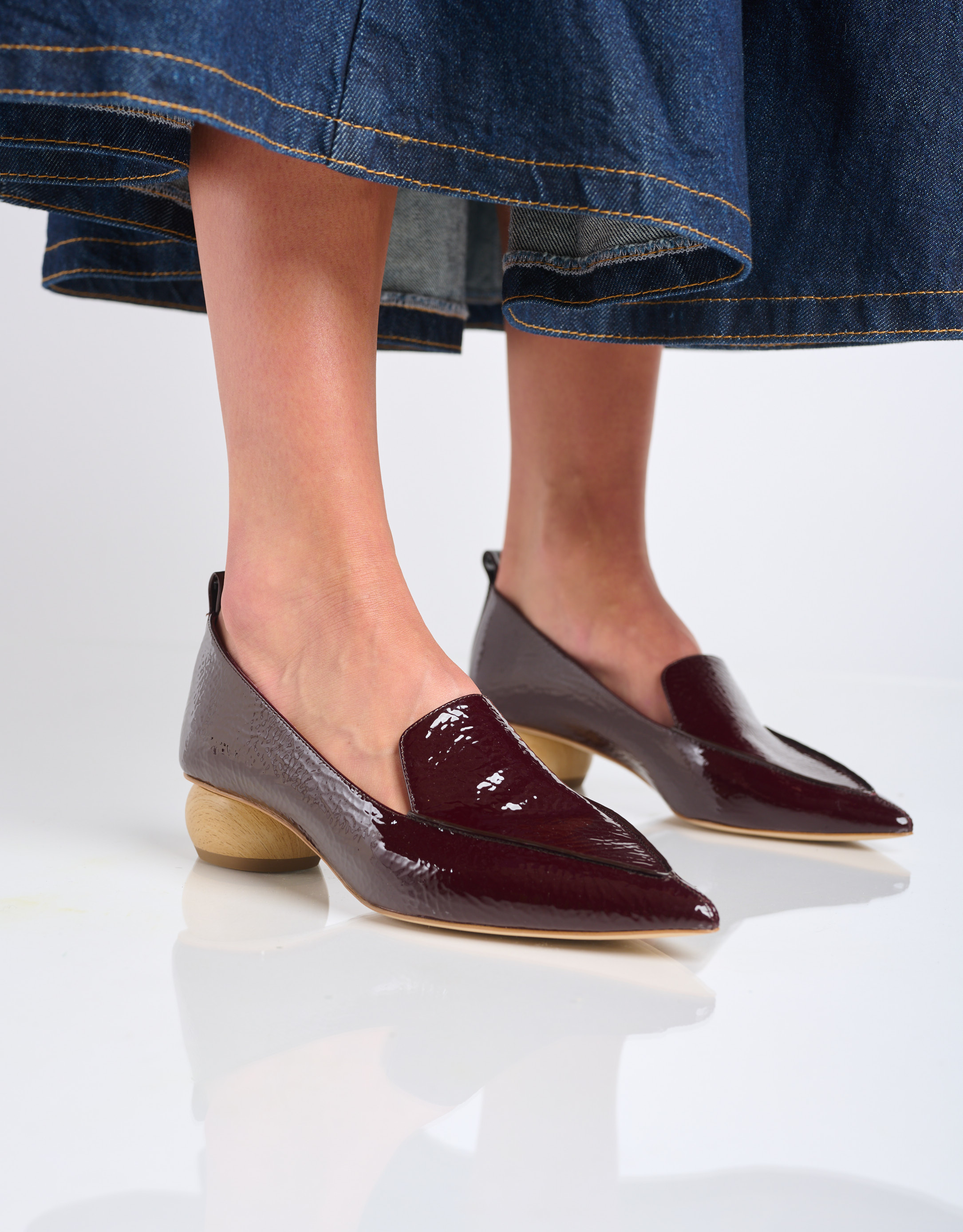 נעלי עקב מעוטרים בניטים בעיצוב וינטג'י, מיוצרות בעבודת יד ומאובזרות בסוליית עור איכותית ועקב קיטן (kitten heel) אופנתי.